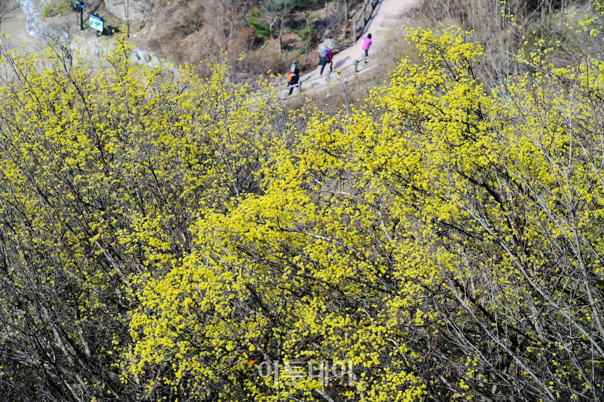 절기상 춘분(春分)을 이틀 앞둔 18일 서울 인왕산 자락에 만개한 산수유가 봄의 정취를 전하고 있다.