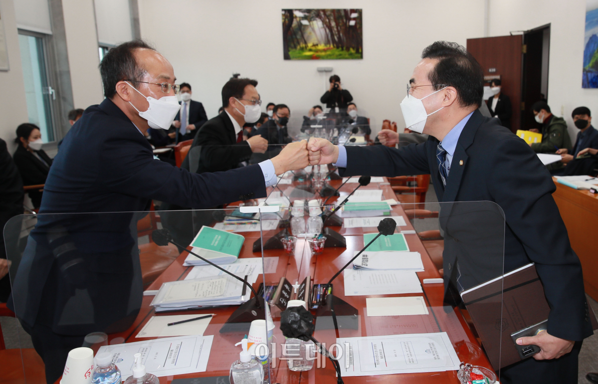 예결위 여당 간사인 박홍근(오른쪽) 더불어민주당 의원과 야당 간사인 추경호 국민의힘 의원이 22일 오전 서울 여의도 국회에서 열린 2021년도 제1회 추경예산안 등 조정소위원회에 참석하며 인사하고 있다.