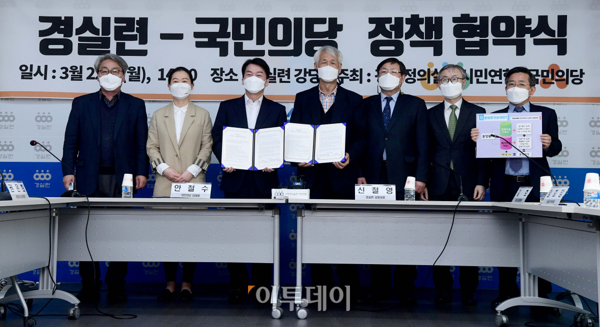 안철수 국민의당 서울시장 후보와 신철영 경실련 공동대표가 22일 서울 종로구 경제정의실천시민연합에서 열린 ‘국민의당-경실련 정책협약식’에서 협약서에 서명한 뒤 기념촬영을 하고 있다.