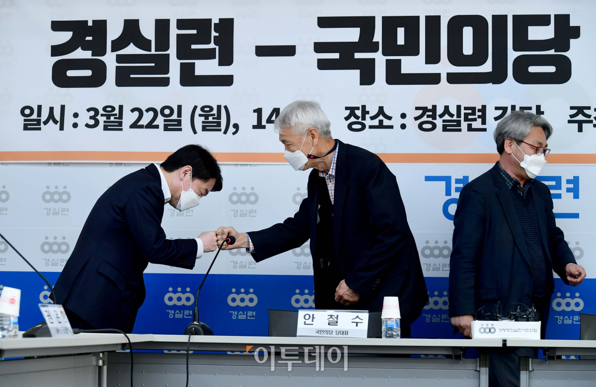 안철수 국민의당 서울시장 후보와 신철영 경실련 공동대표가 22일 서울 종로구 경제정의실천시민연합에서 열린 ‘국민의당-경실련 정책협약식’에서 인사하고 있다.