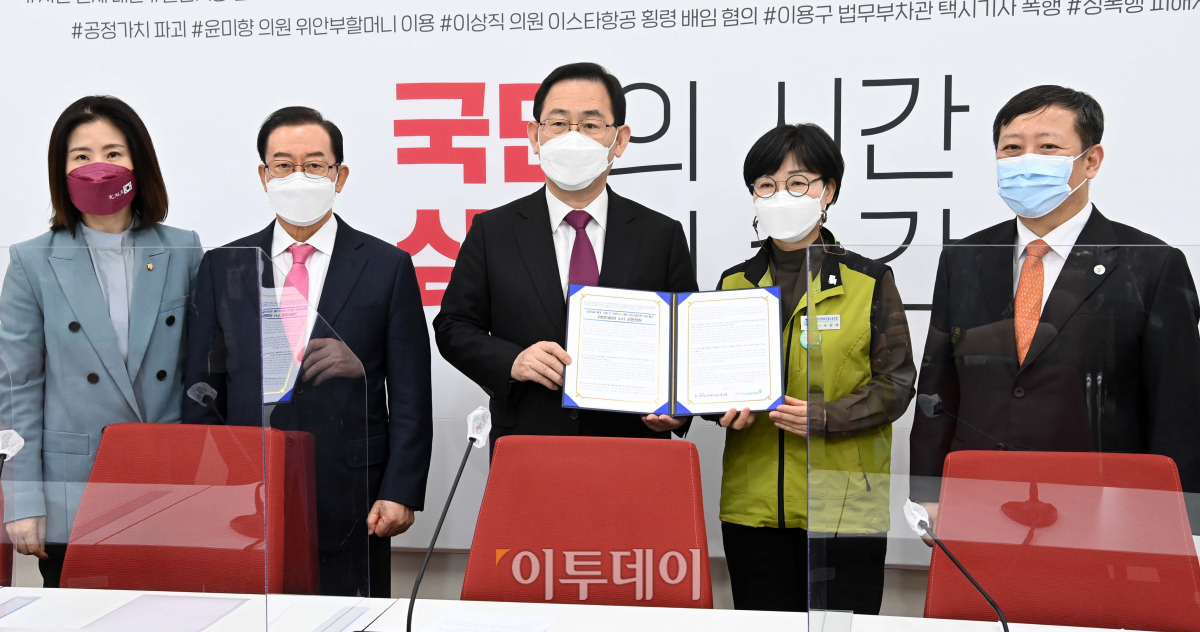 주호영(가운데) 국민의힘 원내대표와 나순자(왼쪽 네번째) 전국보건의료산업노동조합 위원장이 22일 국회에서 열린 전국보건의료산업노조-국민의힘 간담회에서 코로나19 극복 및 보건의료인력 지원체계 구축, 공공보건의료강화를 위한 공동청원문을 전달한 뒤 기념촬영을 하고 있다.