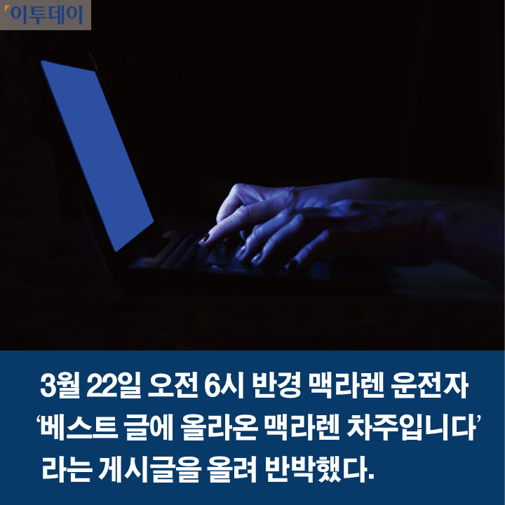 이에 3월 22일 오전 6시 33분경 맥라렌 운전자 측에서는 ‘베스트 글에 올라온 맥라렌 차주입니다’라는 글을 올려 반박했다.