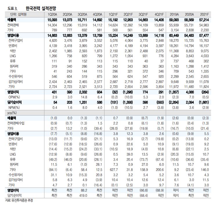 그러나 황 연구원은 “국제유가는 60달러/배럴을 상회했고, LNG 가격이 70만 원/톤까지 상승할 것으로 예상함에 따라 원가에서의 부담이 기존 추정보다 더 커질 것으로 판단한다”면서 “2021년 연평균 전력판매단가 -4.2원/kWh, 원가를 +2.2원/kWh로 수정하고, 연간 영업이익 적자 전환을 예상한다”고 판단했다.