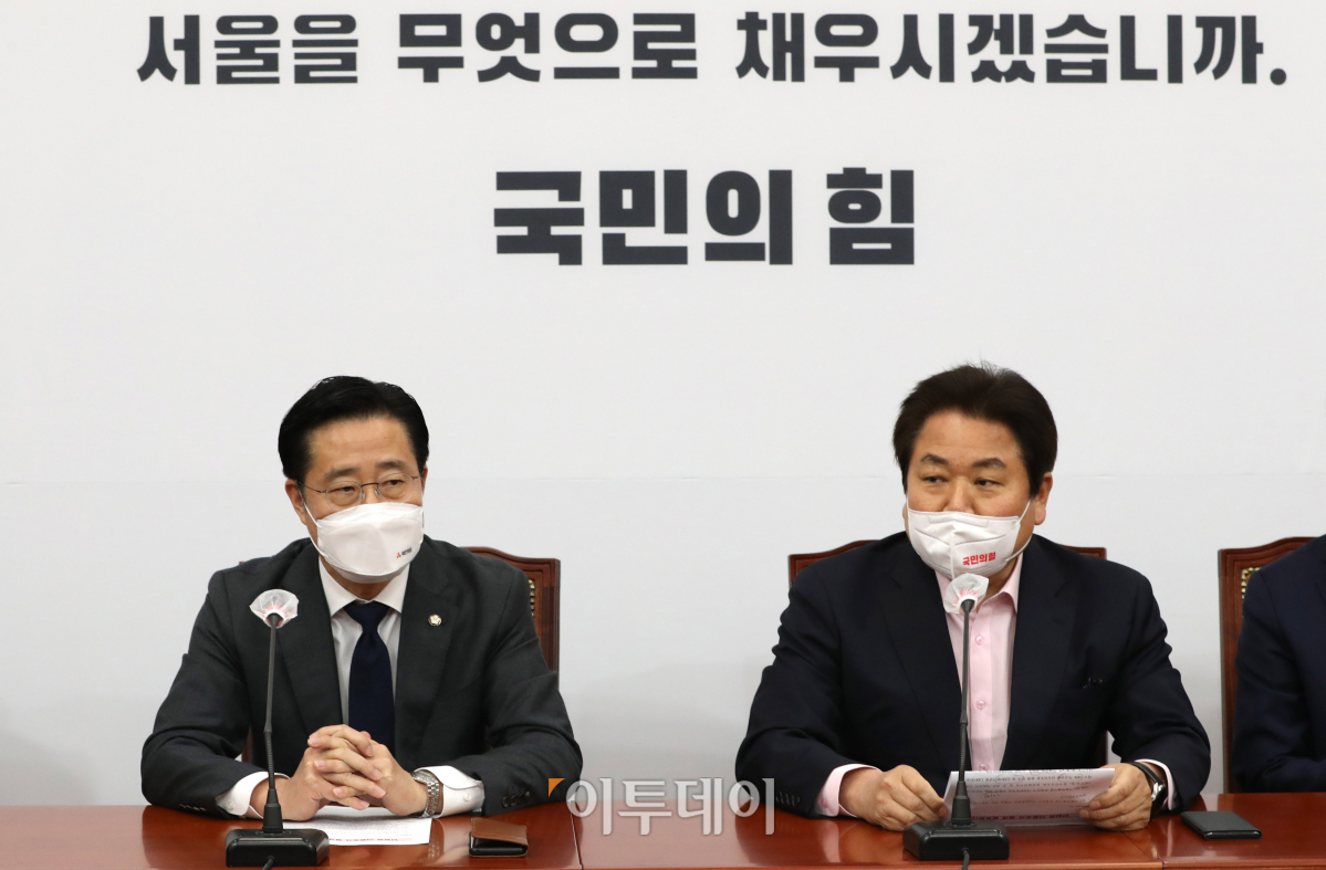 정양석 국민의힘 사무총장과 이태규 국민의당 사무총장이 23일 서울 여의도 국회에서 서울시장 후보의 야권 단일화 후보로 오세훈 국민의힘 후보를 발표하고 있다.