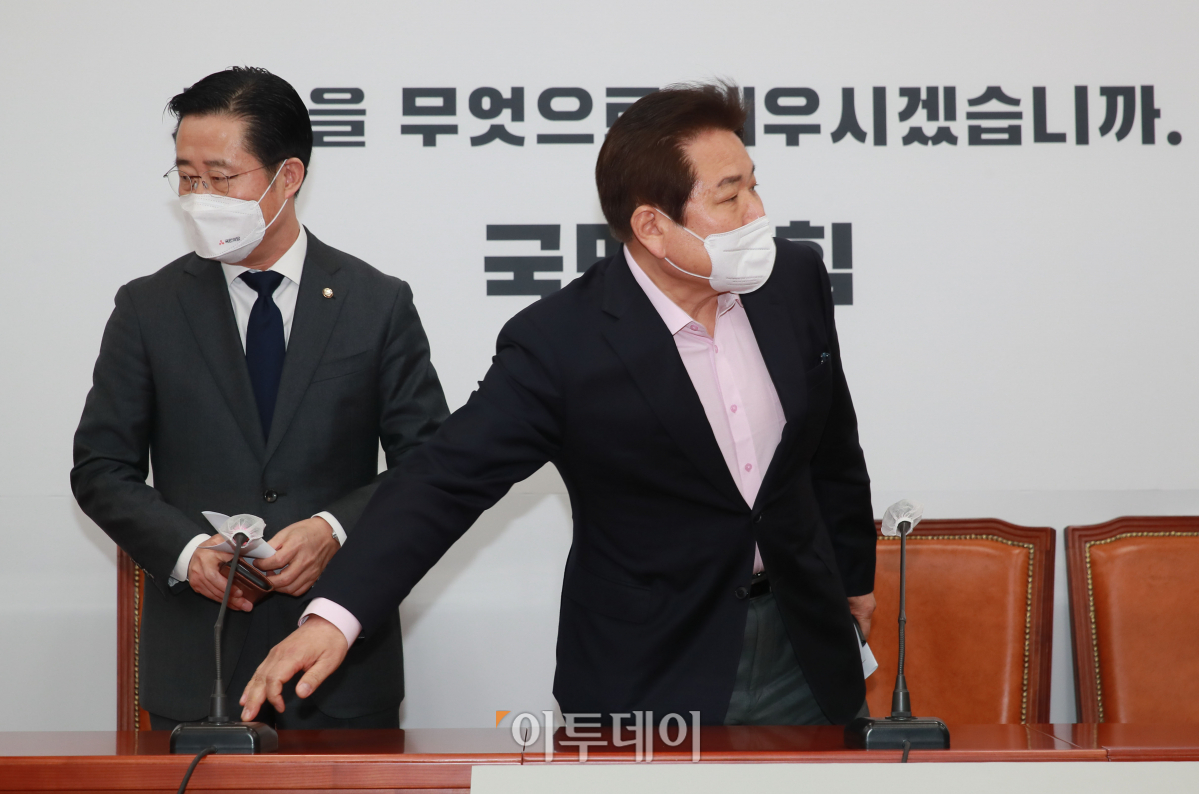 정양석 국민의힘 사무총장과 이태규 국민의당 사무총장이 23일 서울 여의도 국회에서 서울시장 야권 단일화 후보 발표 후 자리를 나서고 있다.