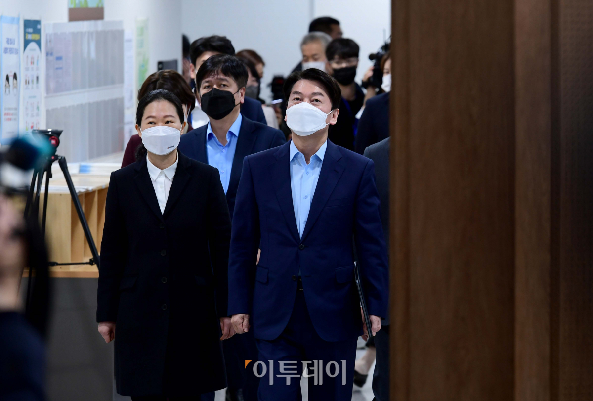안철수 국민의당 서울시장 후보가 23일 서울 여의도 국회에서 단일화 결과 발표 관련 기자회견을 갖기 위해 소통관으로 들어서고 있다.