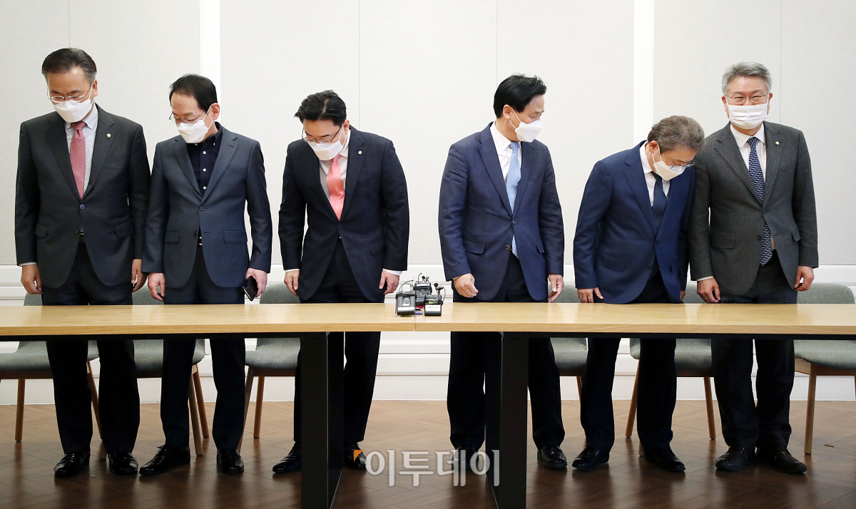 김영진 더불어민주당 원내총괄수석부대표와 김성원 국민의힘 원내수석부대표를 비롯한 참석 의원들이 23일 서울 여의도 국회에서 열린 한국토지주택공사(LH) 사태 관련 특별검사 도입 등을 위한 '3+3' 협의체 회의에서 자리에 앉고 있다. 왼쪽부터 국민의힘 유상범 의원, 김도읍 의원, 김 원내수석부대표, 더불어민주당 김 원내총괄수석부대표, 송기헌 의원, 김회재 의원.