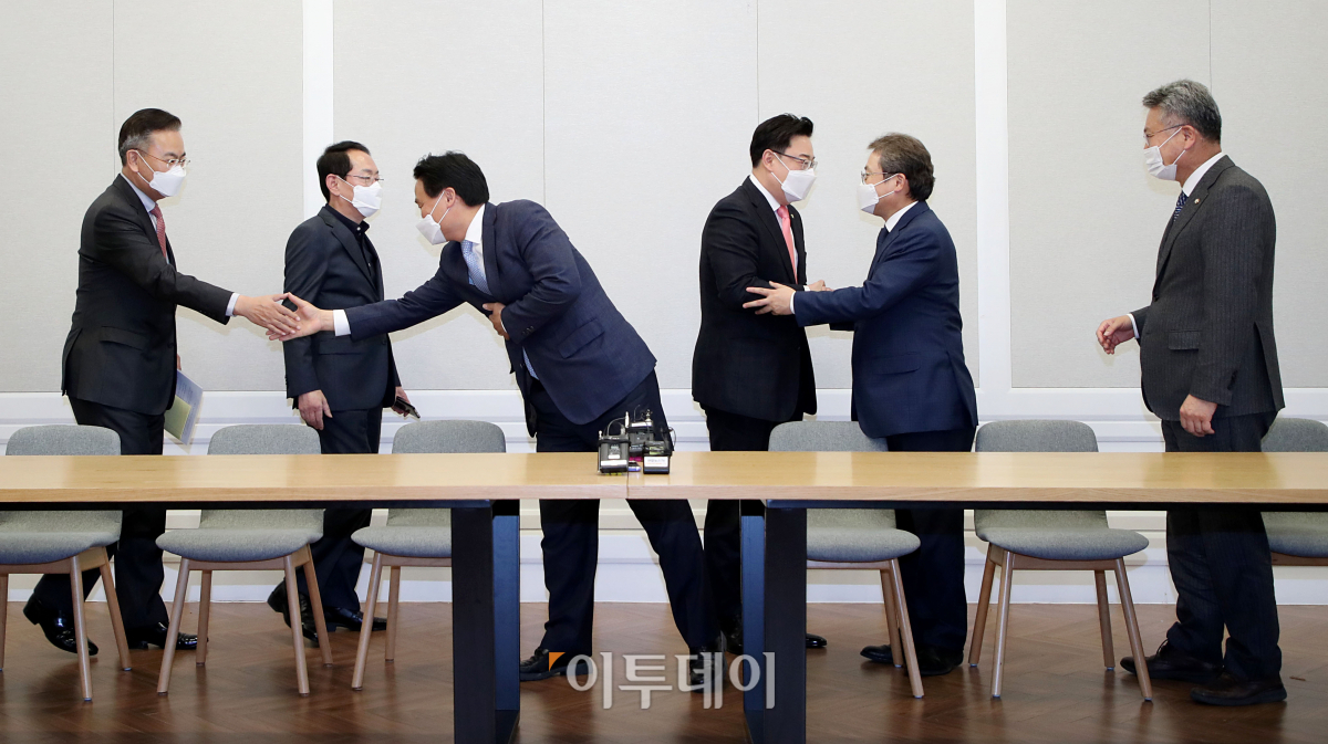 김영진 더불어민주당 원내총괄수석부대표와 김성원 국민의힘 원내수석부대표를 비롯한 참석 의원들이 23일 서울 여의도 국회에서 열린 한국토지주택공사(LH) 사태 관련 특별검사 도입 등을 위한 '3+3' 협의체 회의에서 회의 전 인사를 나누고 있다. 왼쪽부터 국민의힘 유상범 의원, 김도읍 의원, 더불어민주당 김 원내총괄수석부대표, 국민의힘 김 원내수석부대표, 더불어민주당 송기헌 의원, 김회재 의원.
