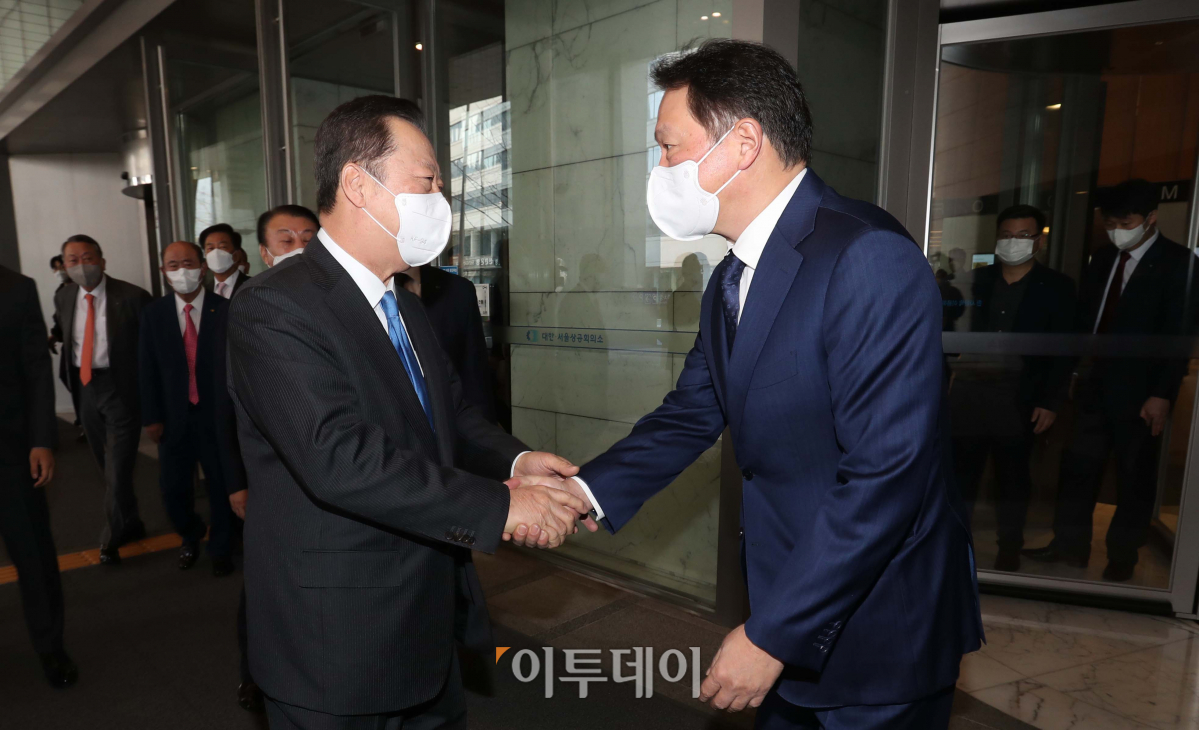 24일 오전 서울 중구 대한상공회의소에서 최태원 SK그룹 회장이 박용만 전임 대한상의 회장을 환송하고있다. 최 회장은 이날 대한상의 회장단 의원총회에서 회장으로 선출됨과 동시에 즉시 회장직을 수행하게 되고, 29일 취임식을 가질 예정이다.