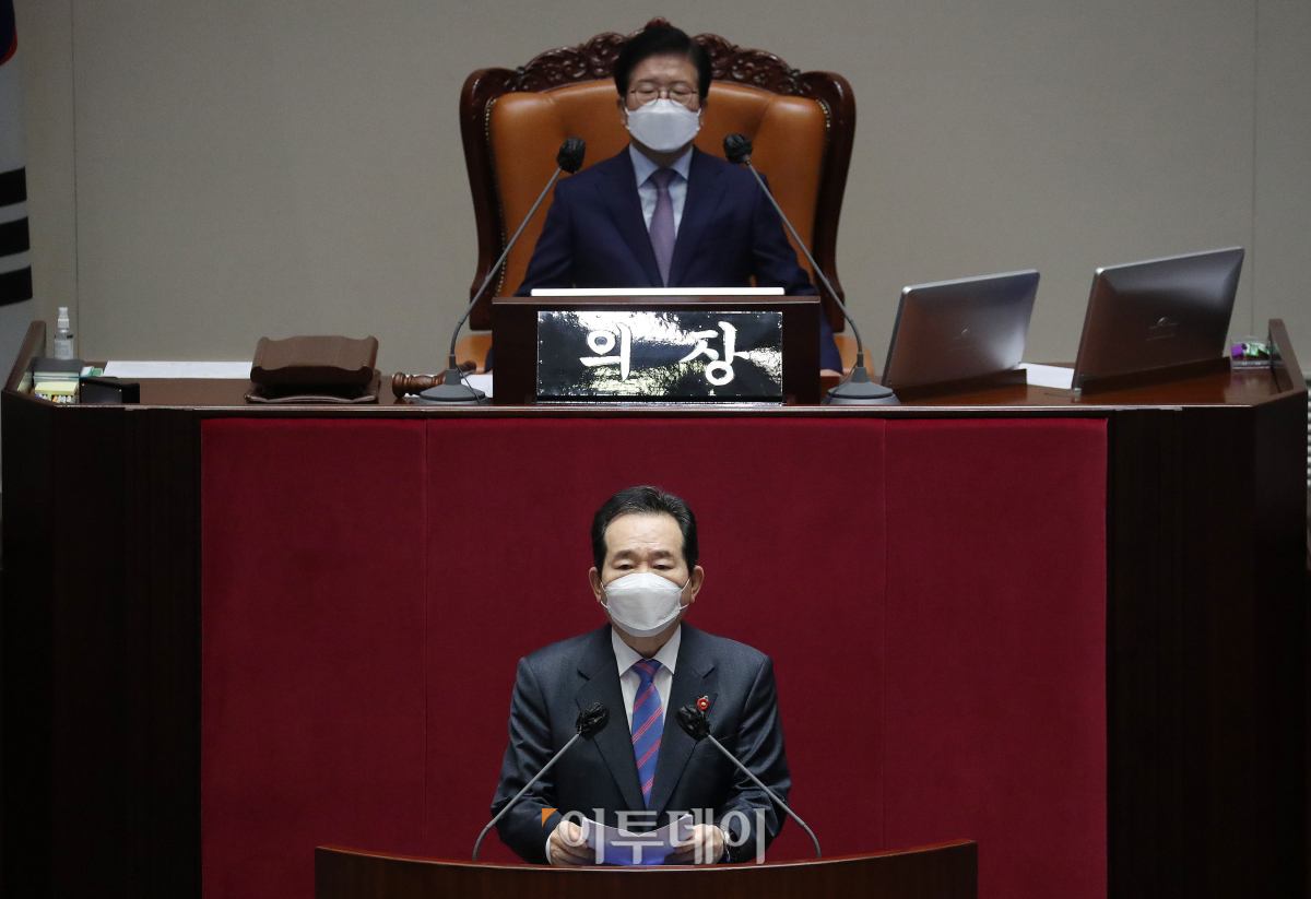 정세균 국무총리가 25일 오전 서울 여의도 국회에서 열린 본회의에서 2021년도 제1회 추가경정예산안 통과 후 인사말을 하고 있다.
