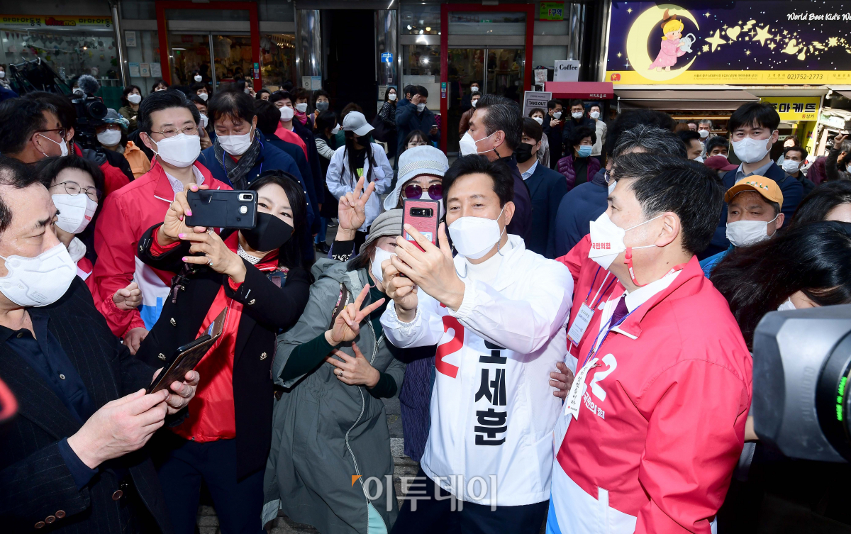 4·7 보궐선거 공식 선거운동 첫날인 25일 오세훈 국민의힘 서울시장 후보가 서울 중구 남대문 시장에서 시민들과 기념촬영을 하고 있다.
