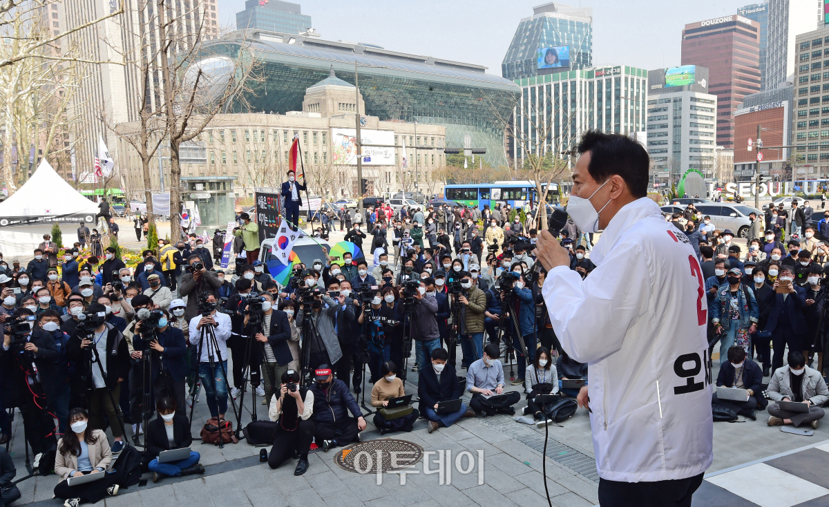오세훈 국민의힘 서울시장 후보가 25일 서울 중구 덕수궁 대한문 앞에서 열린 시청역 거점유세에서 연설을 하며 지지를 호소하고 있다. 국회사진취재단