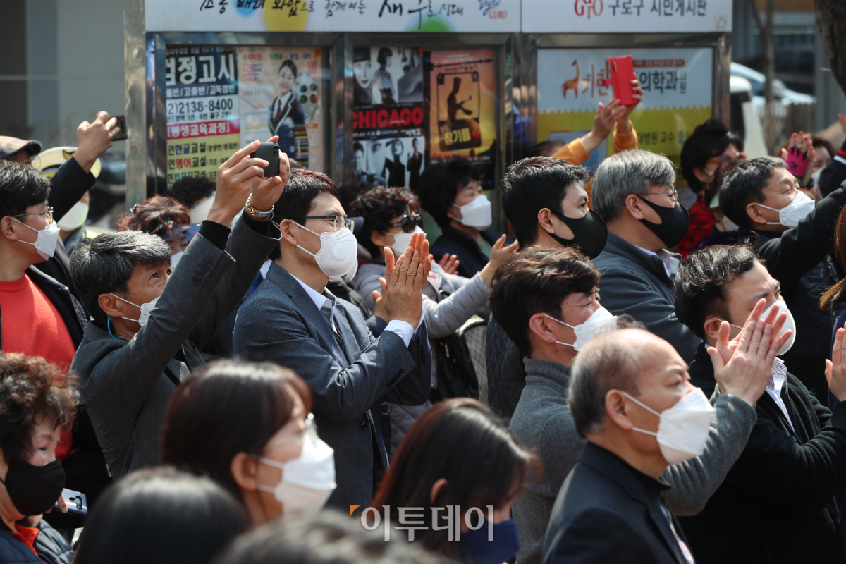 더불어민주당 박영선 서울지장 후보가 4ㆍ7 재보궐 선거운동 첫날인 25일 서울 구로구 구로디지털단지 지플러스타워 앞에서 첫 유세 출정식을 열고 유권자들에게 지지를 호소했다. 유권자들이 박 후보의 연설을 지켜보고 있다. 국회사진취재단