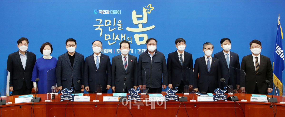 정세균 국무총리와 김태년 더불어민주당 당대표 직무대행을 비롯한 참석자들이 28일 서울 여의도 국회에서 열린 부동산 투기근절 및 재발방지대책을 위한 고위당정협의회에서 기념촬영을 하고 있다. 왼쪽부터 홍익표 정책위의장, 진선미 국회 국토교통위원장, 박광온 사무총장, 홍남기 경제부총리 겸 기획재정부 장관, 정 총리, 김 당대표 직무대행, 김상조 청와대 정책실장, 변창흠 국토교통부 장관, 구윤철 국무조정실장, 최재성 청와대 정무수석.