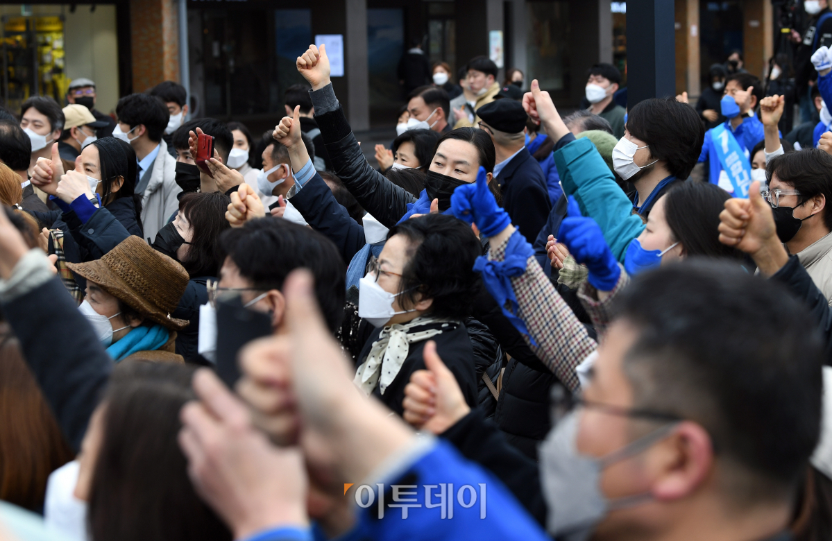 박영선 더불어민주당 서울시장 후보의 서초구 집중유세가 28일 오전 서울 서초 고속터미널 광장에서 열린 가운데 지자들이 박 후보를 연호하고 있다.