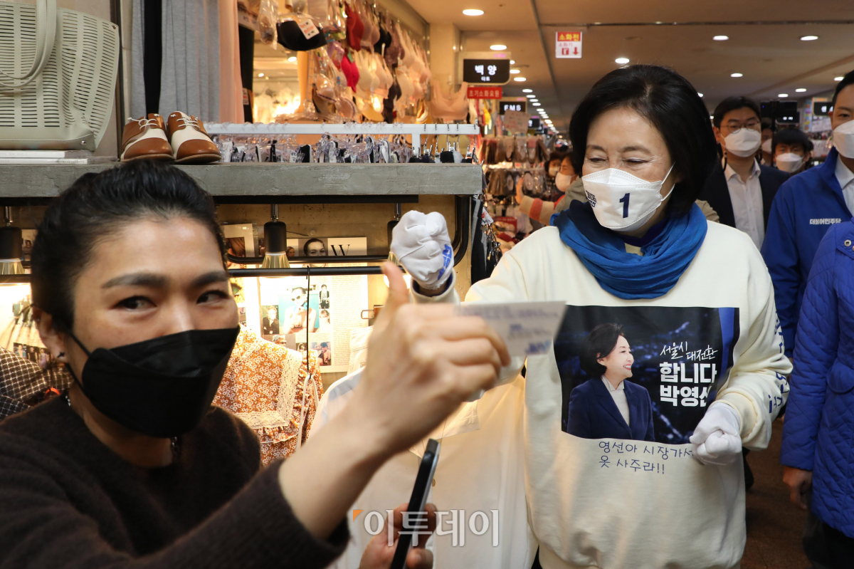 박영선 더불어민주당 서울시장 후보가 28일 서울 서초구 고속터미널 지하상가를 찾아 선거유세를 하고 있다.