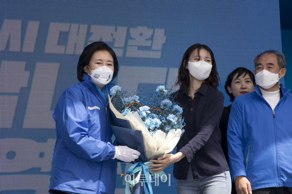 박영선 더불어민주당 서울시장 후보가 29일 서울 성북구 길음역 앞에서 지지자에게 꽃다발을 받고 있다.