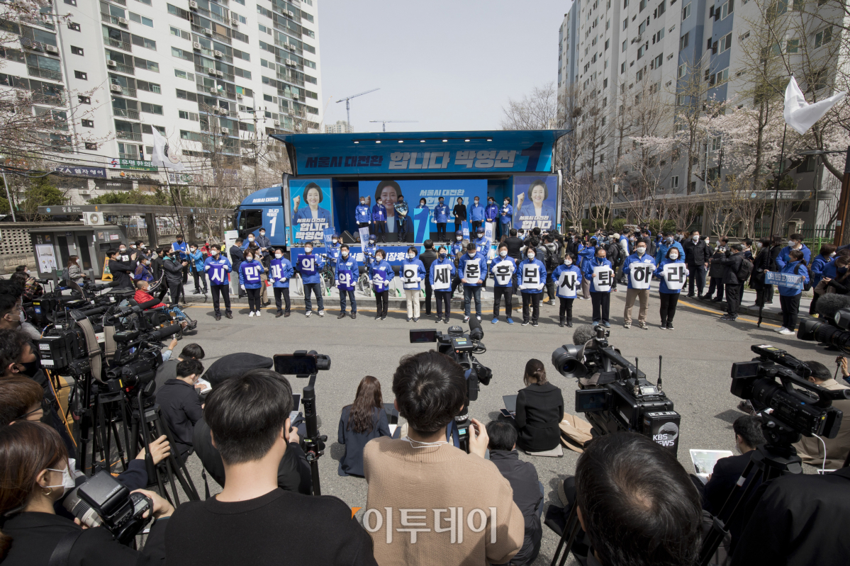 박영선 더불어민주당 서울시장 후보가 29일 서울 성북구 길음역 앞에서 시민들에게 지지를 호소하고 있다.