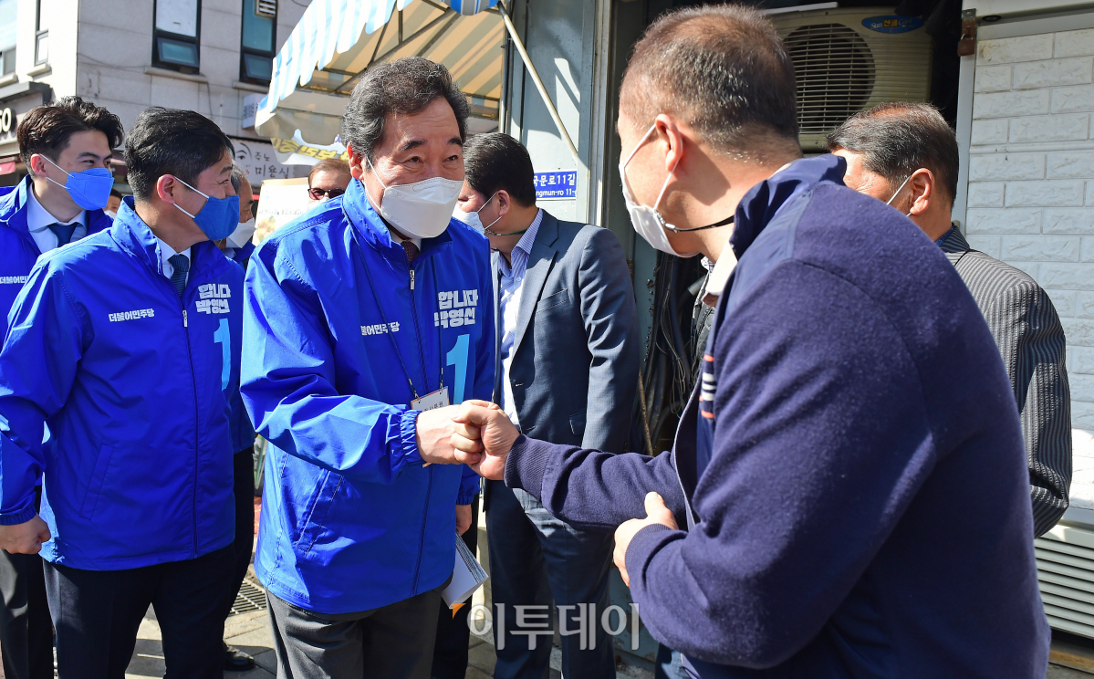이낙연 더불어민주당 상임선대위원장이 30일 서울 성북구 정릉시장에서 박영선 서울시장 후보 지원유세에 앞서 시민들과 인사를 나누고 있다.