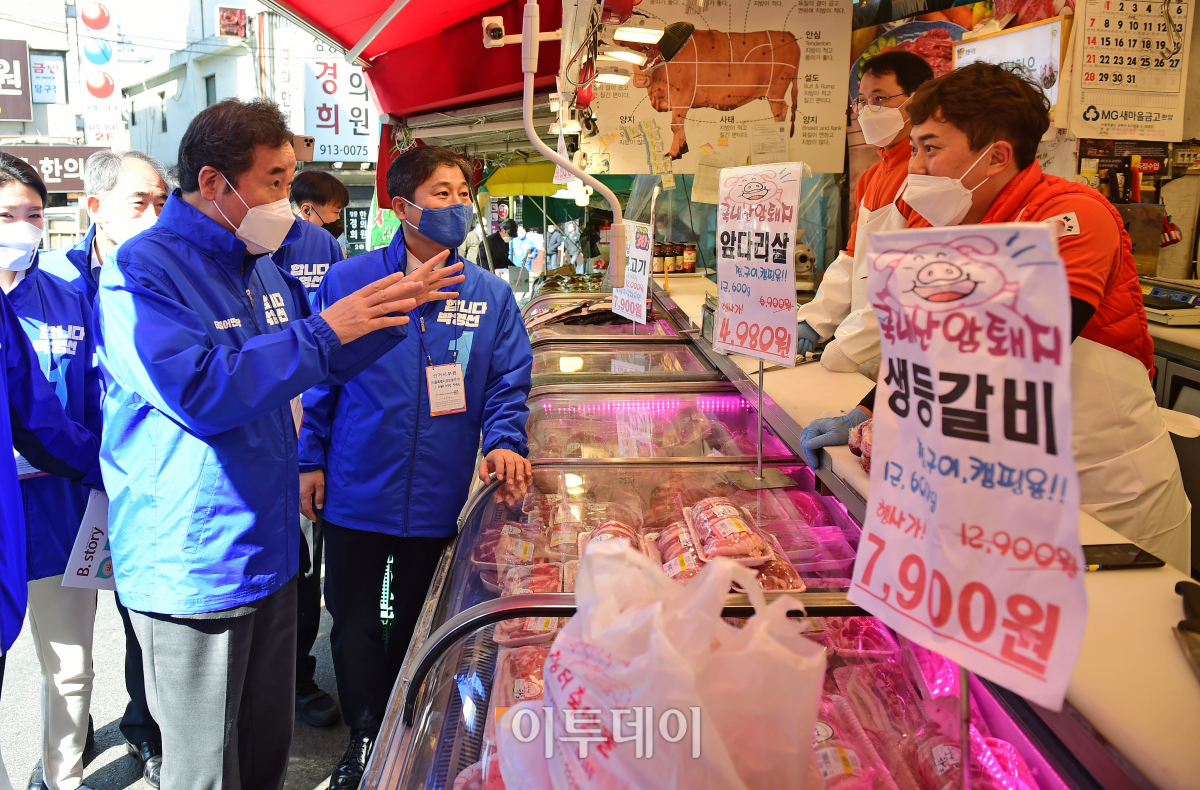 이낙연 더불어민주당 상임선대위원장이 30일 서울 성북구 정릉시장에서 박영선 서울시장 후보 지원유세를 마친 뒤 상인들과 이야기를 나누고 있다.