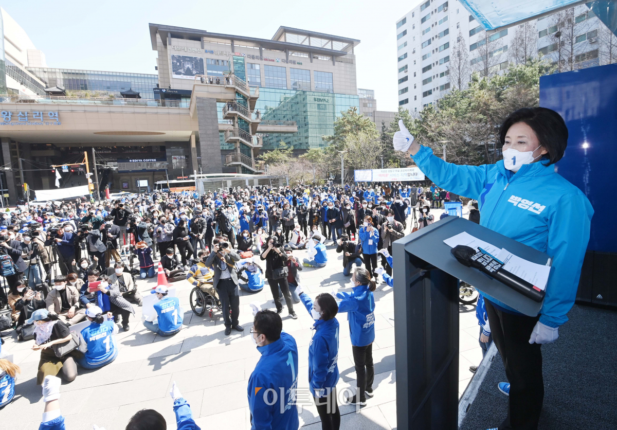 박영선 더불어민주당 서울시장 후보가 30일 서울 성동구 왕십리역 광장에서 열린 집중유세에서 지지를 호소하고 있다.