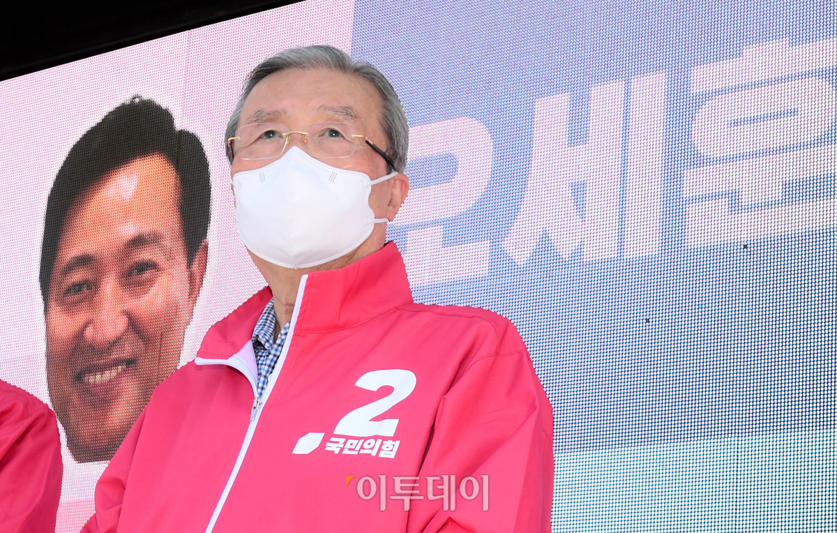 김종인 국민의힘 비상대책위원장이 30일 오후 서울 송파구 거여역사거리에서 4.7 서울시장 재보궐선거 오세훈 서울시장 후보 지원유세를 하고 있다.