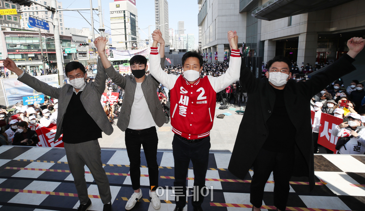 오세훈 국민의힘 서울시장 후보가 30일 오후 서울 영등포역 앞에서 열린 집중유세에서 청년들과 손을 맞잡고 있다.