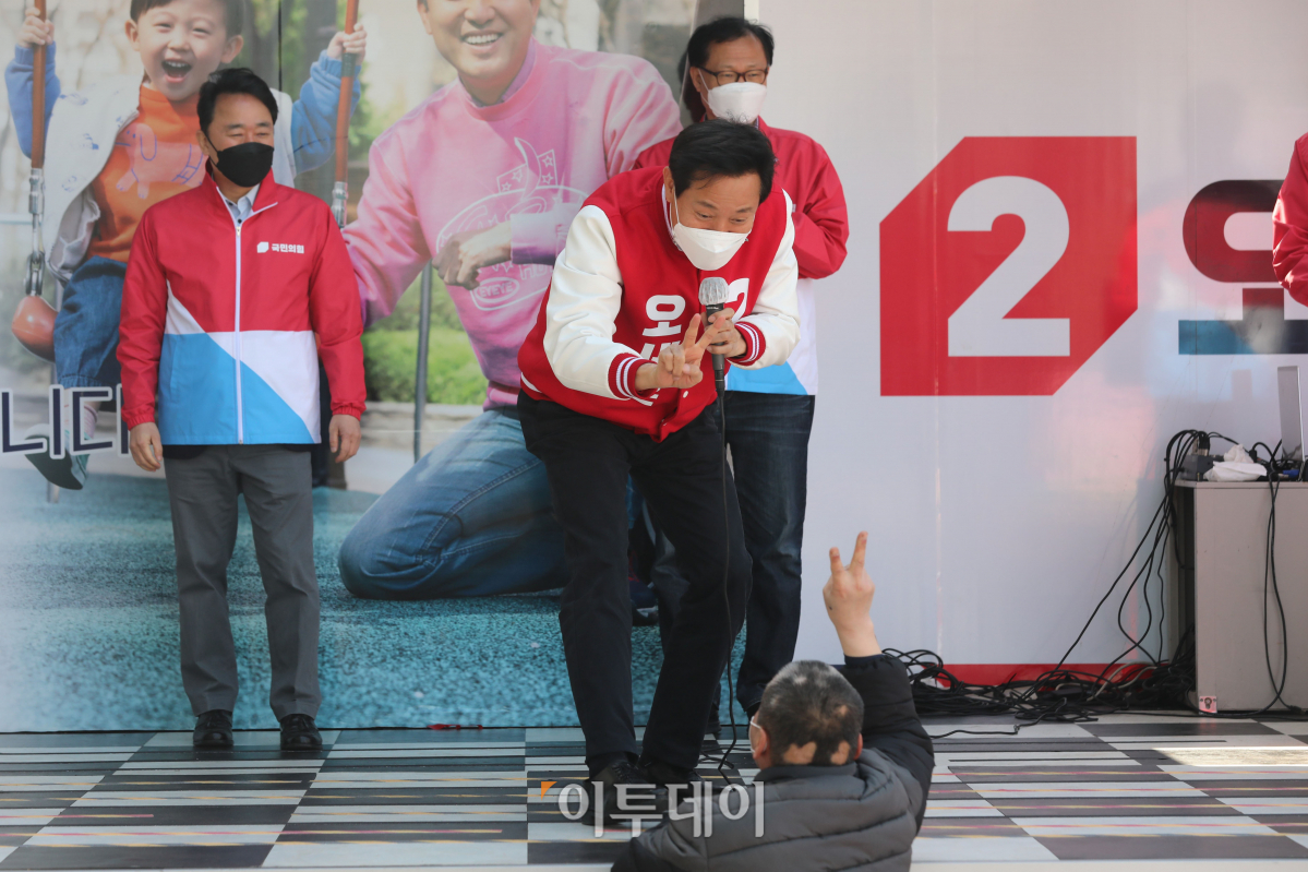 오세훈 국민의힘 서울시장 후보가 30일 오후 서울 영등포역 앞에서 열린 집중유세에서 한 시민과 인사를 나누고 있다.