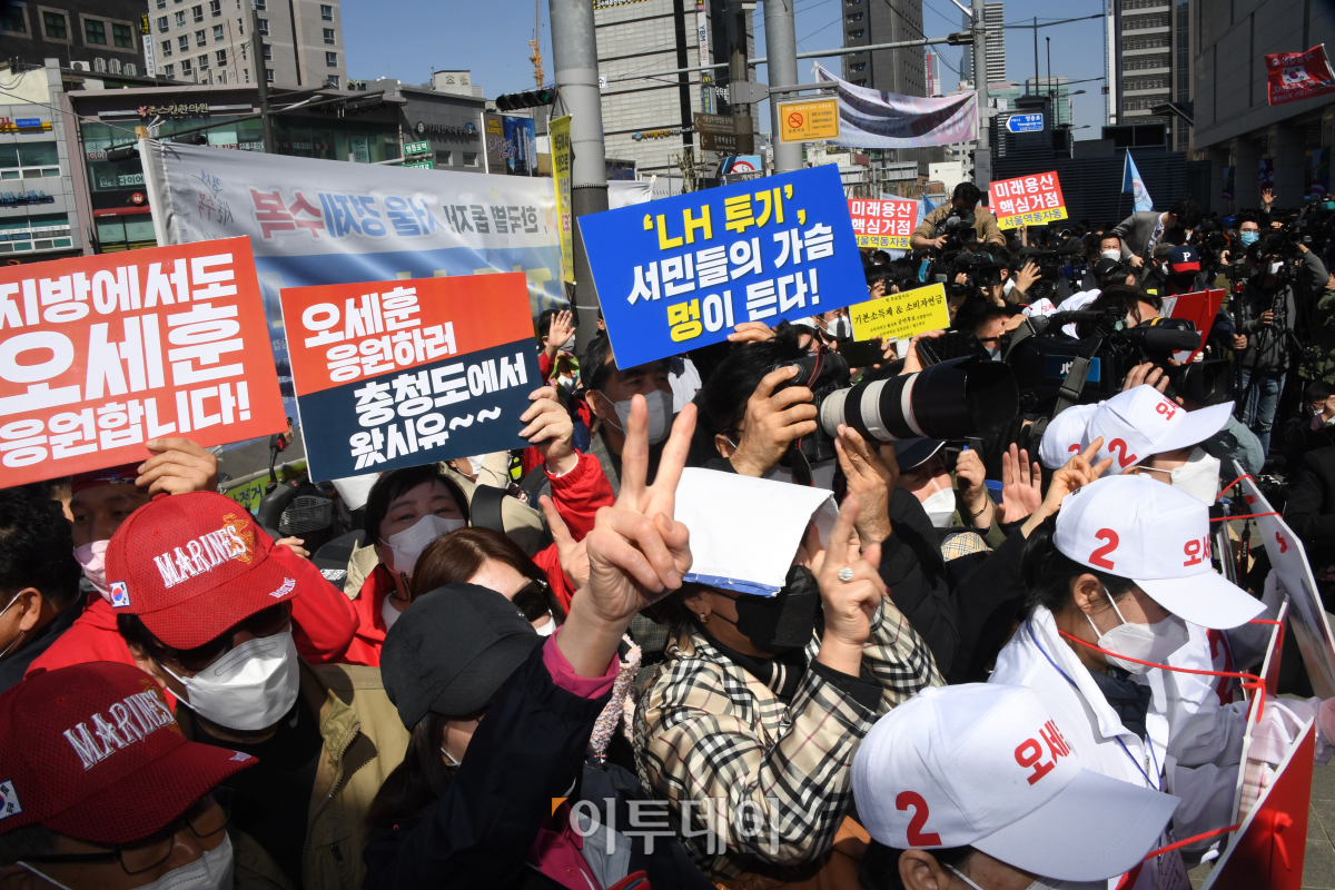 오세훈 국민의힘 서울시장 후보가 30일 영등포역 광장 유세를 하자 지지들이 환호하고 있다.