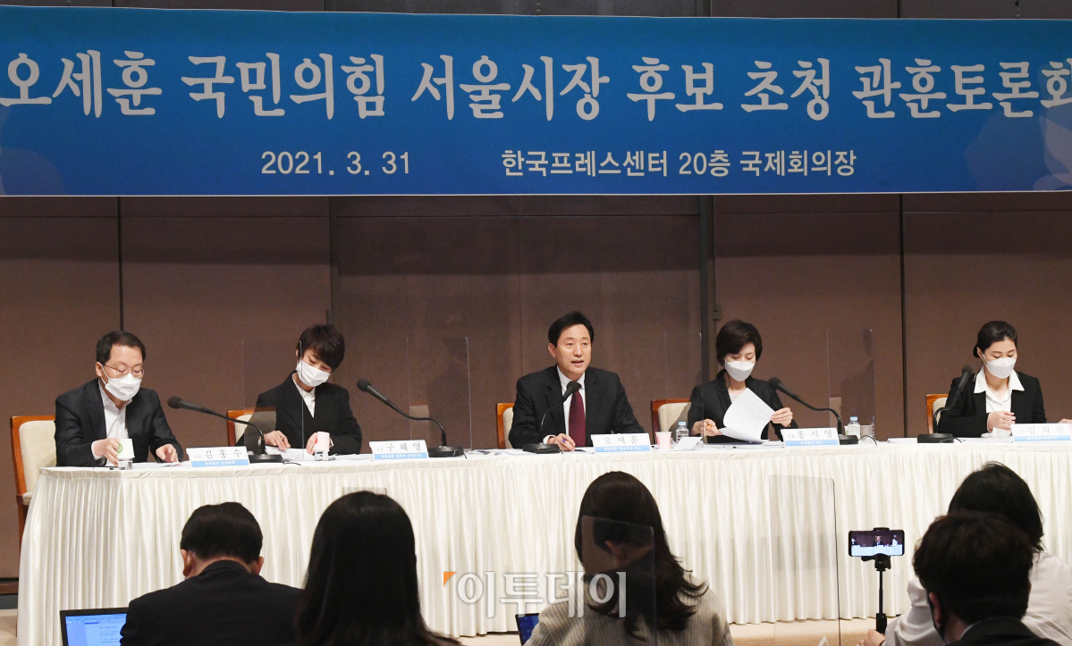 31일 오전 한국프레스센터에서 열린 서울시장후보 초청 관훈토론회에서 오세훈 국민의힘 후보가 기조연설을 하고 있다. 국회사진취재단