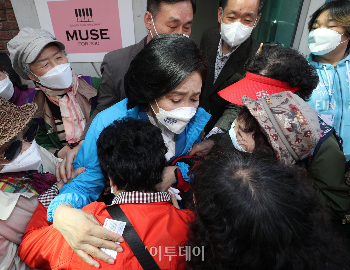 박영선 더불어민주당 서울시장 후보가 31일 오후 서울 동작구 총신대입구역 인근에서 유세 중 노량진수산시장 문제 해결을 촉구하는 상인들을 만나 위로하고 있다.