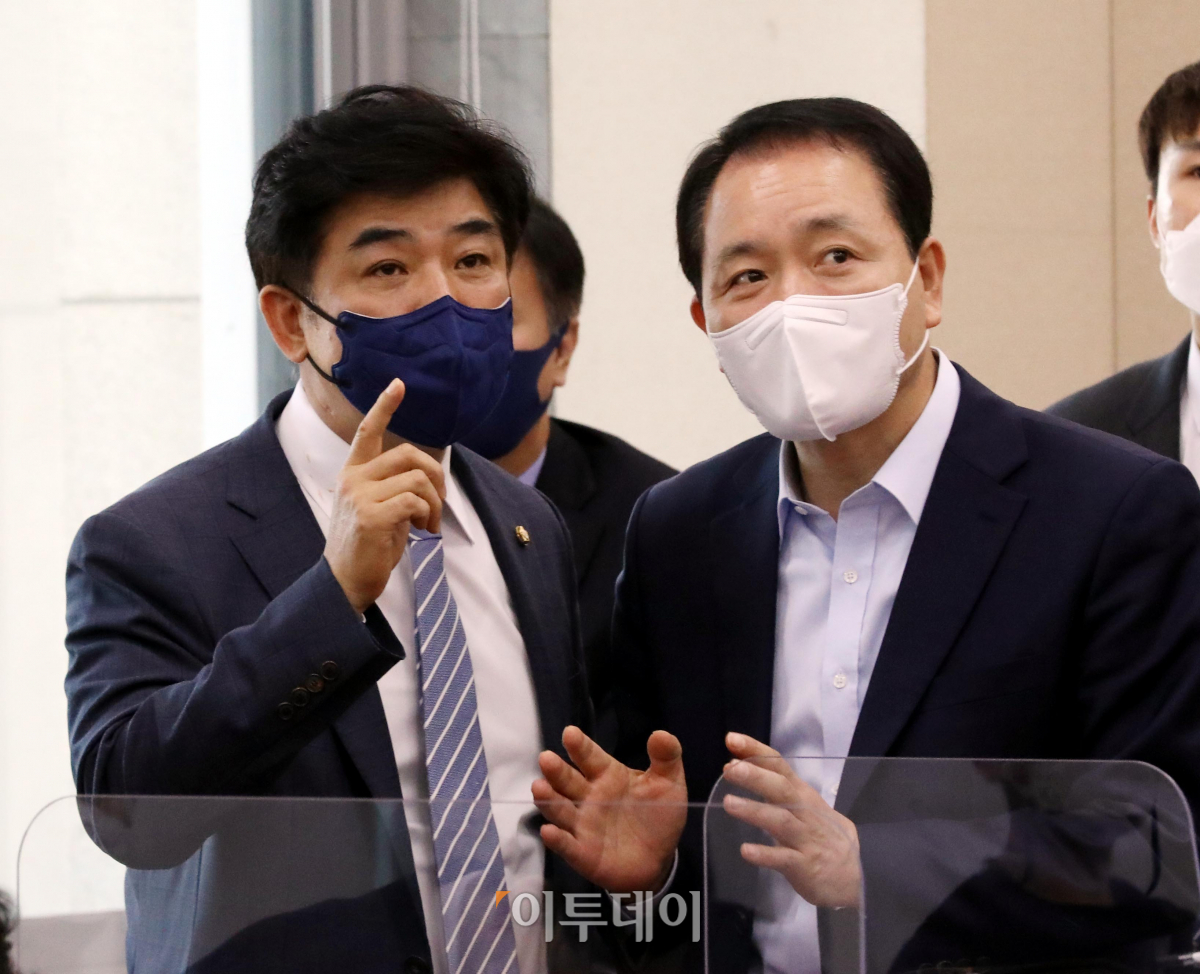 31일 오후 서울 여의도 국회에서 열린 정무위 소위에서 더불어민주당 김병욱 간사와 국민의힘 성일종 소위원장이 의견을 나누고 있다.