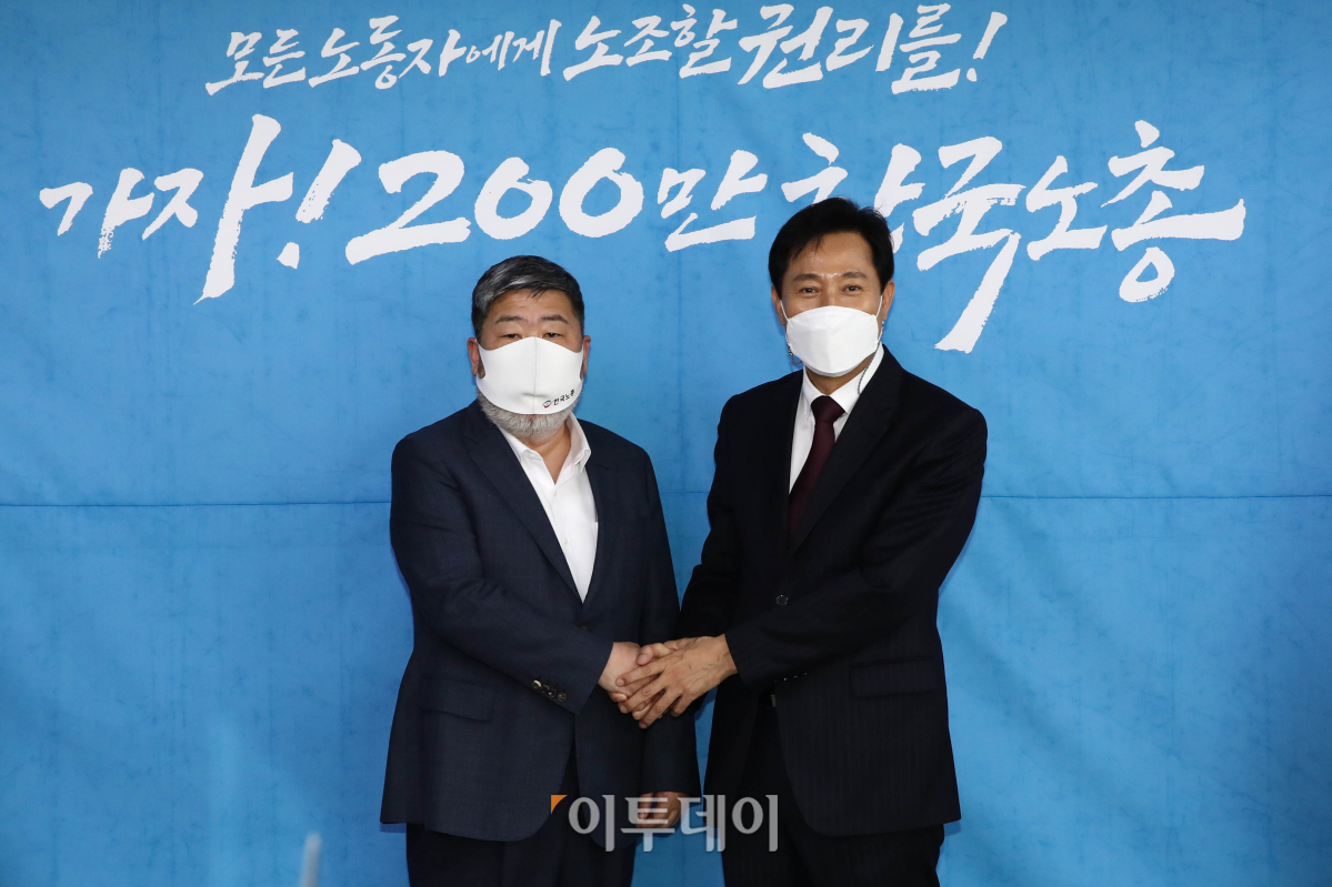 국민의힘 오세훈 서울시장 후보(오른쪽)가 31일 오후 서울 여의도 한국노총을 방문해 김동명 위원장(왼쪽)과 악수하고 있다.