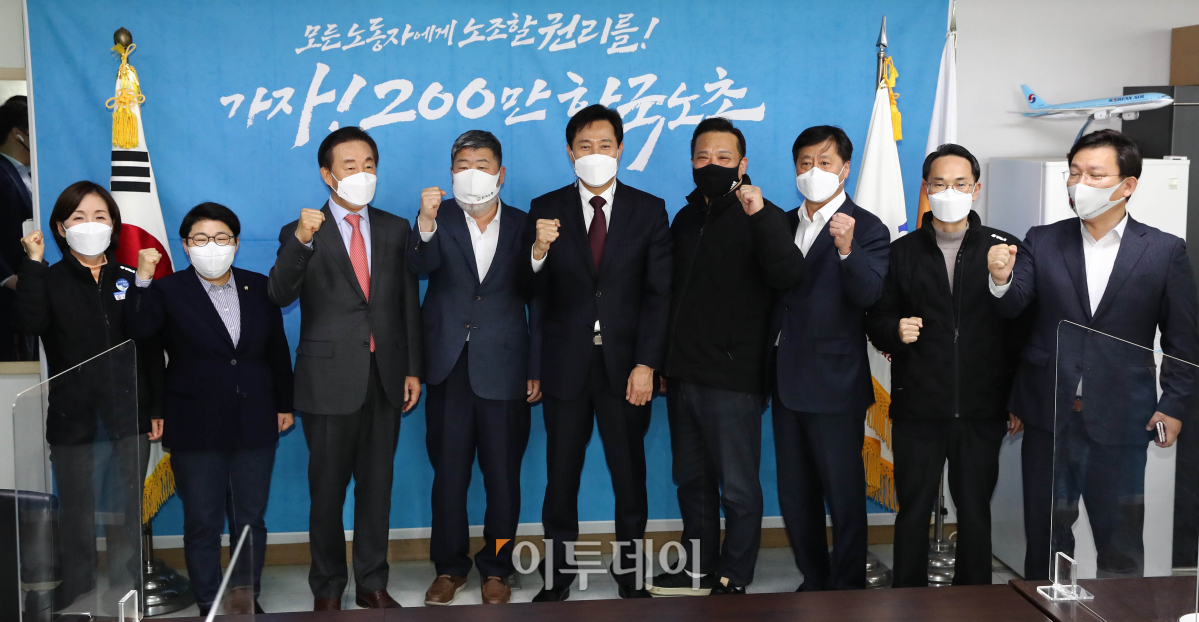 31일 오후 서울 여의도 한국노총을 방문한 국민의힘 오세훈 서울시장 후보(가운데)와 김동명 위원장(왼쪽)등 참석자들이 기념촬영을 하고 있다.