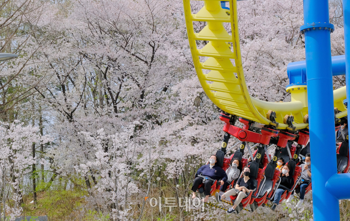 서울 낮 최고기온이 26도를 기록하는 등 5월 중하순의 날씨를 보인 1일 서울 광진구 어린이대공원 놀이동산에서 봄나들이를 나온 시민들이 롤러코스터를 타며 즐거워하고 있다. 서울시설공단은 지난해 일부 노후 놀이시설물을 철거하고, 올해 초 공개경쟁입찰로 새 운영사를 선정하면서 이날 놀이동산 재개장에 들어갔다.