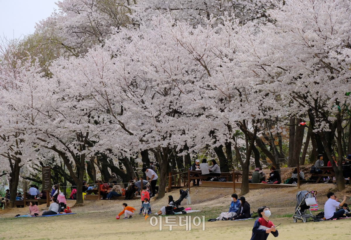 서울 낮 최고기온이 26도를 기록하는 등 5월 중하순의 날씨를 보인 1일 서울 광진구 어린이대공원에 봄나들이를 나온 시민들이 만개한 벚꽃 아래서 계절의 정취를 만끽하고 있다.