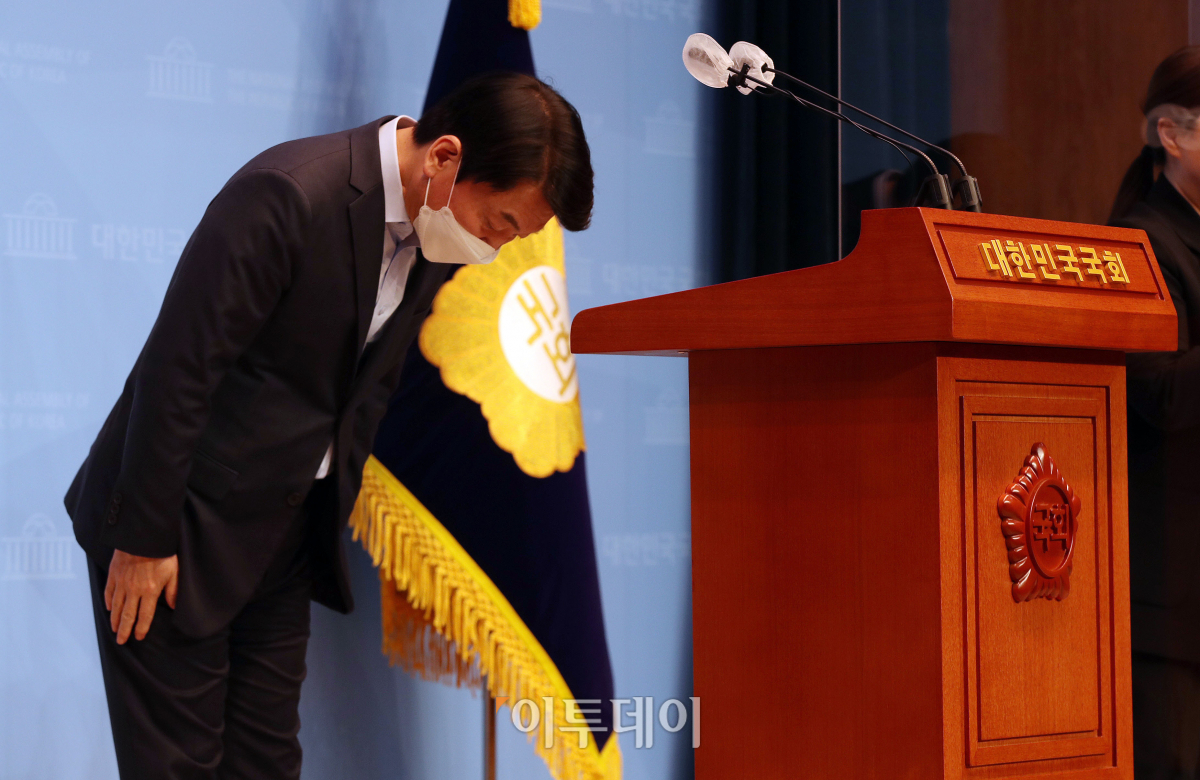 안철수 국민의당 대표가 5일 오전 서울 여의도 국회 소통관에서 4·7재보선 관련 기자회견을 마치고 고개숙여 인사를 하고 있다.