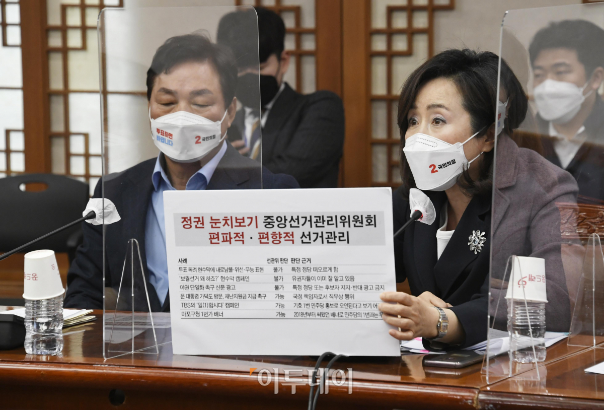 5일 경기도 과천 중앙선거관리위원회에 항의방문 한 전주혜 국민의힘 의원이 선관위의 공정성에 항의하고 있다. 국민의힘은 선관위가 '서울시장 보궐선거 왜 하죠' 현수막 문구 불허, 일간지에 야권 후보 단일화 촉구 광고를 낸 시민에 공직선거법 위반 소지 통보, 투표 독려 문구에 '내로남불' 등 표현 사용을 불허한 선관위가 공정하지 못한 행태를 보인다고 항의했다. 국회사진취재단