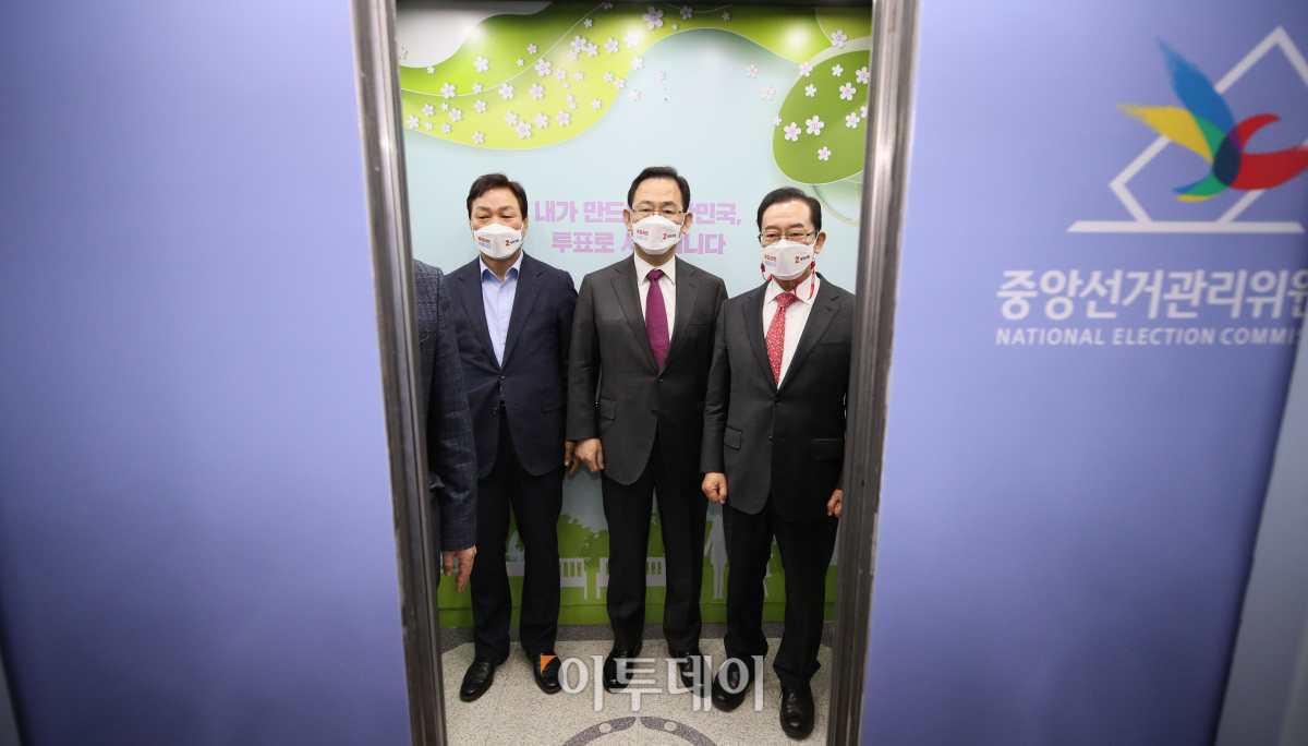 주호영 국민의힘 원내대표가 5일 경기도 과천 중앙선거관리위원회(이하 선관위)에 항의 방문하고 있다. 국민의힘은 선관위가 '서울시장 보궐선거 왜 하죠' 현수막 문구 불허, 일간지에 야권 후보 단일화 촉구 광고를 낸 시민에 공직선거법 위반 소지 통보, 투표 독려 문구에 '내로남불' 등 표현 사용을 불허한 선관위가 공정하지 못한 행태를 보인다고 항의했다. 국회사진취재단