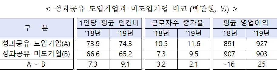 또 성과공유 도입기업이 미도입기업보다 고용창출에 더 긍정적으로 이바지하는 것으로 나타났다. 도입기업의 근로자 수 증가율은 2018년 10.5%, 2019년 11.6%로 같은 기간의 성과공유제 미도입기업은 2018년 7.3%, 2019년 9.5%로 성과공유 도입기업이 2.1~3.2%포인트 더 높았다.