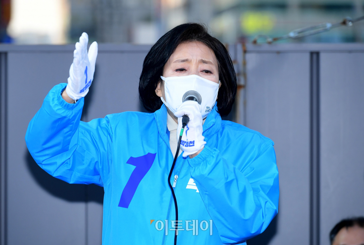 박영선 더불어민주당 서울시장 후보가 5일 오후 서울 관악구 신림역 사거리에서 집중유세를 하고 있다.