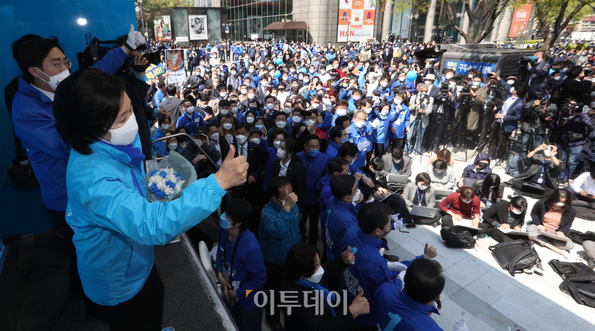 보궐선거 투표를 하루앞둔 6일 박영선 더불어민주당 서울시장 후보가 종로 동화면세점 앞 유세장에서 지지를 호소하고 있다.