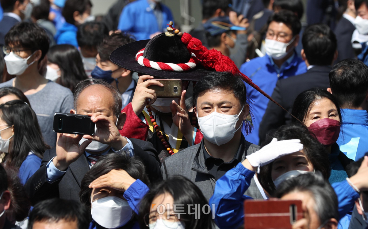 보궐선거 투표를 하루앞둔 6일 박영선 더불어민주당 서울시장 후보가 종로 동화면세점 앞 유세장에서 지지를 호소하는 가운데 시민들이 후보자연설을 경청하고 있다.