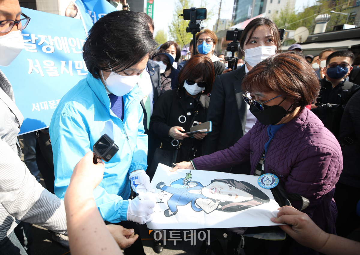 박영선 더불어민주당 서울시장 후보가 6일 오후 서울 서대문구 홍제역 앞에서 집중유세를 하기 위해 유세장으로 향하던 중 시민에게 사인을 해주고 있다.