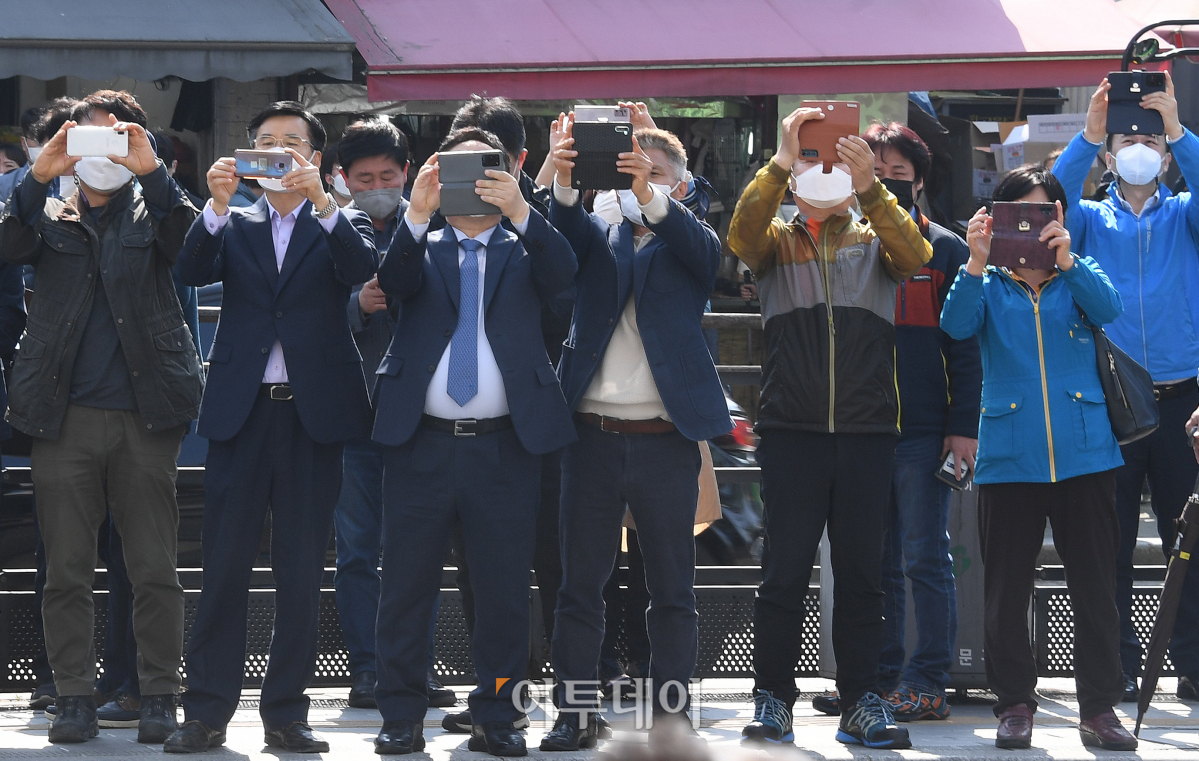 6일 오후 서대문구 홍제역에서 열린 더불어민주당 박영선 서울시장후보자 집중유세에서 유권자들이 핸드폰으로 관심을 표명하고 있다.