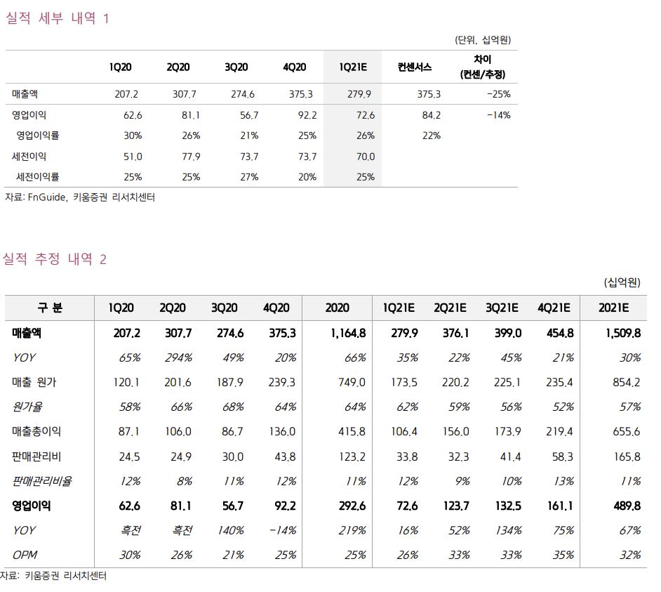 키움증권이 예상하는 삼성바이오로직스 1분기 매출액은 2799억 원, 영업이익은 726억 원으로 전년 대비 각각 35%, 16% 증가할 것으로 내다봤다. 다만 이는 시장 컨센서스를 각각 -25%, -14% 하회한 수준이다.