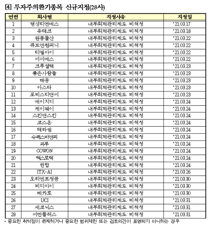 6일 금융감독원 전자공시시스템에 따르면 12월 결산법인 코스닥 상장사 중 28개 기업이 내부회계관리제도에서 ‘비적정’ 의견을 받고 투자환기종목으로 지정됐다. 2년 연속 ‘비적정’을 받으면 상장적격성 실질심사에 올라간다.