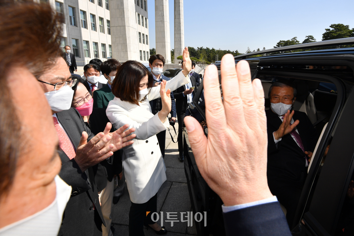 4.7 재보궐선거를 마지막으로 퇴임하는 김종인 국민의힘 비상대책위원장이 8일 오전 서울 여의도 국회를 나서며 주호영 원내대표를 비롯한 당직자들의 배웅을 받고 있다.