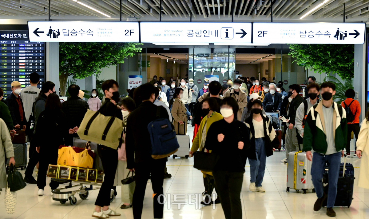 코로나19 신규 확진자가 614명으로 집계, 사흘 연속 600명대를 기록한 11일 서울 강서구 김포공항 국내선 청사가 봄나들이를 나온 시민들로 붐비고 있다. 지난달 3~4백명대를 유지하던 하루 신규 확진자가 이달 들어 6~7백명대를 오르내리며, 봄철 모임과 여행으로 이동량이 늘고 감염재생산지수 등 지표 상황도 좋지 않아 4차 대유행의 우려가 커지고 있다.