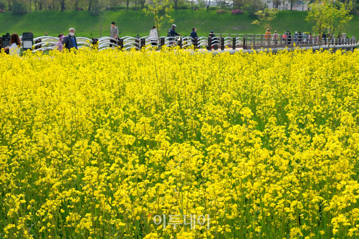 전국이 맑은 가운데 서울 낮 최고기온이 22도를 기록하는 등 따뜻한 봄 날씨를 보인 11일 안양천변에 만개한 유채꽃이 시민들의 시선을 끌고 있다.